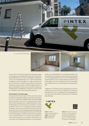 BEST OF Portrait xxx 612Adresse: PINTEX AG Binzm%u00fchlestrasse 60, 8050 Z%u00fcrichTelefon: +41 43 300 95 92E-Mail: info@pintexag.chWeb: www.pintexag.chIn K%u00fcrze: Die dynamische und serviceorientierte Pintex AG %u00fcberzeugt durch ihre erfahrenen Mitarbeitenden und durch das umfangreiche Leistungsangebot in den Bereichen Malerarbeiten, Gipsarbeiten und Bodenbel%u00e4ge.m a l e r g i p s e r p a r k e t tPintex AG dazu motivieren, gemeinsam Spitzenleistungen zu erbringen.%u00bb Auch die offene Kommunikation zeichnet ihn als Gesch%u00e4ftsf%u00fchrer aus. Er ist ein empathischer Vorgesetzter und nimmt seine Mitarbeitenden wahr %u2013 f%u00e4llt ihm etwas Merkw%u00fcrdiges auf, spricht er es gleich an. %u00abLieber man kommuniziert ein bisschen zu viel als zu wenig.%u00bb Bei der Kundschaft handhabt er es genau gleich: Zeitliche Engp%u00e4sse spricht er sofort an. Mit Borilovic weiss man, woran man ist. Obwohl als Fussballspieler zur%u00fcckgetreten, konnte er sich seine Liebe zum Teamgeist und zur Zusammenarbeit bewahren. Schimmelpilz in den WohnungenEinen besonderen Fokus legt die Pintex AG auf die professionelle Schimmelentfernung und -sanierung. %u00abUnser Ziel ist es, nicht nur %u00e4sthetisch ansprechende und funktionsf%u00e4hige R%u00e4ume zu schaffen, sondern auch ein gesundes und sicheres Wohnumfeld zu gew%u00e4hrleisten%u00bb, sagt Danijel Borilovic. Denn: Die Beseitigung von Schimmel ist ein sensibler und wichtiger Bereich, der nicht nur die %u00c4sthetik eines Raumes beeintr%u00e4chtigen, sondern auch ernsthafte Gesundheitsrisiken darstellen kann. Durch den Einsatz geschulter Mitarbeitender und spezialisierter Ausr%u00fcstung kann das Team von Pintex AG Schimmel beseitigen und pr%u00e4ventive Massnahmen ergreifen, um ein erneutes Auftreten zu verhindern. Danijel Borilovic: %u00abMit unserem Fachwissen und unserer Erfahrung sind wir in der Lage, Schimmelprobleme effi zient und nachhaltig zu l%u00f6sen, um das Wohlbefi nden und die Lebensqualit%u00e4t unserer Kund:innen zu verbessern.%u00bb Die Pintex AG ist stolz darauf, mit ihrem ganzheitlichen Ansatz zur Schimmelbe seitigung sowohl %u00e4sthetische als auch gesundheitliche Aspekte zu ber%u00fccksichtigen und einen umfassenden Service anzubieten, der die Bed%u00fcrfnisse und Anforderungen der Kundschaft erf%u00fcllt.Insgesamt ist die Pintex AG eine dynamische und serviceorientierte Firma, die durch ihre Flexibilit%u00e4t, ihre erfahrenen Mitarbeitenden und ihr umfangreiches Leistungsangebot in den Bereichen Malerarbeiten, Gipsarbeiten und Bodenbel%u00e4ge %u00fcberzeugt.Vor- und nach der SchimmelentfernungBEST OF Stadt Z%u00fcrich