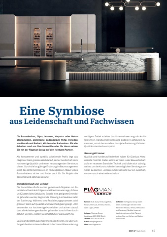 BEST OF BEST OF Stadt Z%u00fcrich Portrait xxx 654 Eine Symbioseaus Leidenschaft und FachwissenOb Fassadenbau, Gips-, Maurer-, Verputz- oder Natursteinarbeiten, allgemeine Bodenbel%u00e4ge FSTZ, Verlegen von Mosaik und Parkett, K%u00fcchen oder Badumbau. F%u00fcr alle Arbeiten rund um Ihre Immobilie oder Ihr Haus setzen Sie mit der Flagman Group auf den richtigen Partner.Als kompetente und speditiv arbeitende Profi s legt das Flagman- Team grossen Wert darauf, seiner Kundschaft stets hochwertige Qualit%u00e4t und einen herausragenden Service zu bieten. Durch die langj%u00e4hrige Erfahrung im Baumanagement stellt das Unternehmen einen reibungslosen Ablauf jedes Bauvorhabens sicher und fi ndet auch f%u00fcr Ihr Projekt die passende und optimale L%u00f6sung.Immobilienkauf und -verkaufDie Immobilien-Profi s suchen gezielt nach Objekten mit Potenzial und ber%u00fccksichtigen dabei Faktoren wie Lage, Gr%u00f6sse und Zustand des Geb%u00e4udes. Sobald eine geeignete Immobilie gefunden wurde, beginnt die Planung des Neubaus oder der Sanierung. W%u00e4hrend des Realisierungsprozesses wird grossen Wert auf Qualit%u00e4t und Nachhaltigkeit gelegt. %u00abWir verwenden nur hochwertige Materialien und achten darauf, dass alle Arbeiten gem%u00e4ss den geltenden Vorschriften durchgef%u00fchrt werden%u00bb, betont Gesch%u00e4ftsf%u00fchrer Gianluca Mirto.Das Team besteht aus erfahrenen Expert:innen, die %u00fcber umfangreiche Kenntnisse im Bereich der Immobiliensanierung Partner: SCIC Italia, Fendi, Lagerfeld, Maison, Elie Saab, Ariostea, Flaviker, Labor Legno, UPtilesAdresse: Flagman Group Asylstrasse 119, 8032 Z%u00fcrich Telefon: +41 76 638 09 29E-Mail: info@flagman.chWeb: www.flagman.chIn K%u00fcrze: Die Flagman Group bietet einen zuverl%u00e4ssigen Service in den Bereichen Neubau, Umbau, Renovation und Sanierung. Dar%u00fcber hinaus ist das Unternehmen auf die Planung und den Bau von K%u00fcchen und B%u00e4dern spezialisiert.verf%u00fcgen. Dabei arbeitet das Unternehmen eng mit Architekt:innen, Handwerker:innen und anderen Fachleuten zusammen, um sicherzustellen, dass jede Sanierung h%u00f6chsten Qualit%u00e4tsstandards entspricht.Besser geht immerQualit%u00e4t und Kundenzufriedenheit haben f%u00fcr Gianluca Mirto oberste Priorit%u00e4t. Dabei setzt das Team in der Bauwirtschaft auf den neuesten Stand der Technik und bildet sich st%u00e4ndig weiter, um der Kundschaft den bestm%u00f6glichen Service garantieren zu k%u00f6nnen. %u00abUnsere Arbeit ist nicht nur ein Gesch%u00e4ft, sondern auch eine Leidenschaft.%u00bb