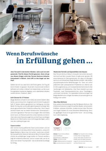 BEST OF BEST OF Z%u00fcrcher Unterland 691%u00abDas Tierwohl in den besten H%u00e4nden%u00bb w%u00e4re auch ein sehr passender Titel f%u00fcr dieses Portr%u00e4t gewesen. Denn mit genau diesem Slogan wirbt das Tierarzt Zentrum inklusive Katzenhotel in B%u00fclach. Und trifft so den Nagel auf den Kopf.Stellen Sie sich vor, dass Sie in die Ferien gehen. Ein Flug ab Z%u00fcrich-Kloten ist geplant. Rund zehn Autominuten entfernt befi ndet sich mitten in B%u00fclach ein Katzenhotel, wo Sie zuvor Ihre geliebten Vierbeiner abgeben und in allerbesten H%u00e4nden wissen k%u00f6nnen. Praktisch, oder?Acht Zimmer f%u00fcr 17 KatzenBiagio Barberio schw%u00e4rmt vom Hotel, das seinen G%u00e4sten alles bietet, was sie brauchen. Insgesamt acht Zimmer f%u00fcr gesamthaft 17%u00a0Katzen stehen ganzj%u00e4hrlich zur Verf%u00fcgung. Und das Beste: Ihr Haustier wird zudem gleich passend versorgt, falls akute gesundheitlichen Probleme auftauchen. Denn haupts%u00e4chlich fi ndet man an dieser Adresse eine Tierarztpraxis %u2013 und nicht irgendeine. Man kann es so sagen: Wer eine Katze, einen Hund, ein Meerschweinchen, einen Hamster, ein Kaninchen oder einen Kanarienvogel hat und die Praxis von Biagio Barberio ist in Reichweite, muss nicht lange %u00fcberlegen, wohin man den Liebling bringen soll.Cuore e anima%u00abWir sind ein hochqualifi ziertes Team und k%u00fcmmern uns mit viel Herzblut um die Gesundheit Ihres Haustiers%u00bb, verspricht Biagio Barberio. Wenn man ihm zuh%u00f6rt, merkt man schnell: Der sympathische Italiener lebt seinen Beruf mit jeder Faser. %u00abSchon als achtj%u00e4hriger Junge wollte ich Tierarzt werden%u00bb, sagt der erfahrene Veterin%u00e4r. Und wir wissen alle, wie es ist, wenn man seinen Traumjob lebt %u2013 das ist die beste Grundlage f%u00fcr Erfolg.Modernste Technik und Spezialit%u00e4ten des HausesDas Tierarzt Zentrum B%u00fclach ist sowohl menschlich als auch technisch auf dem neusten Stand. Es gibt einen grossen OP, einen kleineren f%u00fcr Zahnoperationen, ein Labor, ein R%u00f6ntgenzentrum und Ultraschall. Biagio Barberio erkl%u00e4rt: %u00abWir bieten physiotherapeutische Behandlungen f%u00fcr Tiere mit orthop%u00e4dischen oder postoperativen Problemen an, ebenso wie Ern%u00e4hrungsberatung und komplement%u00e4rmedizinische Behandlungen mit Kaltplasma.%u00bb Das Team besteht aus zwei Tier%u00e4rzten, zwei Praxisassistentinnen, einer Tierpflegerin und einem Lernenden. F%u00fcr speziellere Untersuchungen hat Biagio Barberio die richtigen Kontakte und verweist gerne an Kolleg:innen weiter. Wau-Wau WellnessEine weitere Dienstleistung ist das Pet Beauty Zentrum. Die erfahrene Groomerin sorgt mit sanftem Baden, schonendem Entfi lzen, pr%u00e4zisen Schnitten, Krallen k%u00fcrzen oder %u00d6hrchen und Augen s%u00e4ubern f%u00fcr eine stressfreie Behandlung. Denn ein gepflegter Hund ist ein gl%u00fccklicher Hund %u2013 ob wuschelig, kurz- oder langhaarig.Adresse: Tierarzt Zentrum B%u00fclachKatzenhotel B%u00fclachBahnhofstrasse 3, 8180 B%u00fclachTelefon: +41 43 511 42 06E-Mail: info@tierarztzentrum-buelach.chWeb: www.tierarztzentrum-buelach.chIn K%u00fcrze: Das Tierwohl ist hier eindeutig im Fokus. Med. vet. Biagio Barberio und sein Team lieben ihren Beruf und schaffen damit die idealen Voraussetzungen f%u00fcr ihre tierischen Patient:innen und deren Besitzer:innen.Wenn Berufsw%u00fcnsche in Erf%u00fcllung gehen %u2026