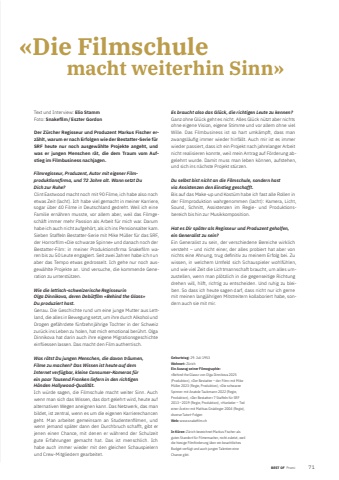 BEST OF BEST OF Promi 712%u00abDie Filmschule macht weiterhin Sinn%u00bbText und Intervie Elio StammFoto: Snakefi lm / Eszter GordonDer Z%u00fcrcher Regisseur und Produzent Markus Fischer erz%u00e4hlt, warum er nach Erfolgen wie der Bestatter-Serie f%u00fcr SRF heute nur noch ausgew%u00e4hlte Projekte angeht, und was er jungen Menschen r%u00e4t, die dem Traum vom Aufstieg im Filmbusiness nachjagen.Filmregisseur, Produzent, Autor mit eigener Filmproduktionsfi rma, und 72 Jahre alt. Wann setzt Du Dich zur Ruhe?Clint Eastwood macht noch mit 90 Filme, ich habe also noch etwas Zeit (lacht). Ich habe viel gemacht in meiner Karriere, sogar %u00fcber 40 Filme in Deutschland gedreht. Weil ich eine Familie ern%u00e4hren musste, vor allem aber, weil das Filmgesch%u00e4ft immer mehr Passion als Arbeit f%u00fcr mich war. Darum habe ich auch nicht aufgeh%u00f6rt, als ich ins Pensionsalter kam. Sieben Staffeln Bestatter-Serie mit Mike M%u00fcller f%u00fcr das SRF, der Horrorfi lm %u00abDie schwarze Spinne%u00bb und danach noch der Bestatter-Film: in meiner Produktionsfi rma Snakefi lm waren bis zu 50 Leute engagiert. Seit zwei Jahren habe ich nun aber das Tempo etwas gedrosselt. Ich gehe nur noch ausgew%u00e4hlte Projekte an. Und versuche, die kommende Generation zu unterst%u00fctzen.Wie die lettisch-schweizerische Regisseurin Olga Dinnikova, deren Deb%u00fctfi lm %u00abBehind the Glass%u00bb Du produziert hast.Genau. Die Geschichte rund um eine junge Mutter aus Lettland, die alles in Bewegung setzt, um ihre durch Alkohol und Drogen gef%u00e4hrdete f%u00fcnfzehnj%u00e4hrige Tochter in der Schweiz zur%u00fcck ins Leben zu holen, hat mich emotional ber%u00fchrt. Olga Dinnikova hat darin auch ihre eigene Migrationsgeschichte einfliessen lassen. Das macht den Film authentisch.Was r%u00e4tst Du jungen Menschen, die davon tr%u00e4umen, Filme zu machen? Das Wissen ist heute auf dem Internet verf%u00fcgbar, kleine Consumer-Kameras f%u00fcr ein paar Tausend Franken liefern in den richtigen H%u00e4nden Hollywood-Qualit%u00e4t. Ich w%u00fcrde sagen, die Filmschule macht weiter Sinn. Auch wenn man sich das Wissen, das dort gelehrt wird, heute auf alternativen Wegen aneignen kann. Das Netzwerk, das man bildet, ist zentral, wenn es um die eigenen Karrierechancen geht. Man arbeitet gemeinsam an Studentenfi lmen, und wenn jemand sp%u00e4ter dann den Durchbruch schafft, gibt er jenen einen Chance, mit denen er w%u00e4hrend der Schulzeit gute Erfahrungen gemacht hat. Das ist menschlich. Ich habe auch immer wieder mit den gleichen Schauspielern und Crew-Mitgliedern gearbeitet.Geburtstag: 29. Juli 1953Wohnort: Z%u00fcrichEin Auszug seiner Filmographie: %u00abBehind the Glass%u00bb von Olga Dinnikova 2025 (Produktion), %u00abDer Bestatter %u2013 der Film%u00bb mit Mike M%u00fcller 2023 (Regie, Produktion), %u00abDie schwarze Spinne%u00bb mit Anatole Taubmann 2022 (Regie, Produktion), %u00abDer Bestatter%u00bb 7 Staffeln f%u00fcr SRF 2013 %u2013 2019 (Regie, Produktion), %u00abHunkeler %u2013 Tod einer %u00c4rztin%u00bb mit Mathias Gn%u00e4dinger 2004 (Regie), diverse Tatort-FolgenWeb: www.snakefi lm.ch In K%u00fcrze: Z%u00fcrich bezeichnet Markus Fischer als guten Standort f%u00fcr Filmemacher, nicht zuletzt, weil die hiesige Filmf%u00f6rderung %u00fcber ein beachtliches Budget verf%u00fcgt und auch jungen Talenten eine Chance gibt.Es braucht also das Gl%u00fcck, die richtigen Leute zu kennen?Ganz ohne Gl%u00fcck geht es nicht. Alles Gl%u00fcck n%u00fctzt aber nichts ohne eigene Vision, eigene Stimme und vor allem ohne viel Wille. Das Filmbusiness ist so hart umk%u00e4mpft, dass man zwangsl%u00e4ufi g immer wieder hinf%u00e4llt. Auch mir ist es immer wieder passiert, dass ich ein Projekt nach jahrelanger Arbeit nicht realisieren konnte, weil mein Antrag auf F%u00f6rderung abgelehnt wurde. Damit muss man leben k%u00f6nnen, aufstehen, und sich ins n%u00e4chste Projekt st%u00fcrzen.Du selbst bist nicht an die Filmschule, sondern hast via Assistenzen den Einstieg geschafft. Bis auf das Make-up und Kost%u00fcm habe ich fast alle Rollen in der Filmproduktion wahrgenommen (lacht): Kamera, Licht, Sound, Schnitt, Assistenzen im Regie- und Produktionsbereich bis hin zur Musikkomposition.Hat es Dir sp%u00e4ter als Regisseur und Produzent geholfen, ein Generalist zu sein?Ein Generalist zu sein, der verschiedene Bereiche wirklich versteht %u2013 und nicht einer, der alles probiert hat aber von nichts eine Ahnung, trug defi nitiv zu meinem Erfolg bei. Zu wissen, in welchem Umfeld sich Schauspieler wohlf%u00fchlen, und wie viel Zeit die Lichtmannschaft braucht, um alles umzustellen, wenn man pl%u00f6tzlich in die gegenseitige Richtung drehen will, hilft, richtig zu entscheiden. Und ruhig zu bleiben. So dass ich heute sagen darf, dass nicht nur ich gerne mit meinen langj%u00e4hrigen Mitstreitern kollaboriert habe, sondern auch sie mit mir.