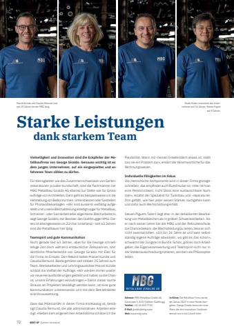 721 BEST OF BEST OF Z%u00fcrcher Unterland Portrait xxxStarke Leistungen dank starkem TeamAdresse: MBG Metallbau Giraldo AGZunstrasse 5, 8152 Opfi kon-GlattbruggTelefon: +41 44 810 77 03E-Mail: giraldo@mbg.swissWeb: www.mbg.swissIn K%u00fcrze: Die Metallbau-Firma wurde per Januar 2023 in neue H%u00e4nde %u00fcbergeben. George Giraldo heisst der neue Mann, der den innovativen Traditionsbetrieb nun in die Zukunft f%u00fchrt.Vielseitigkeit und Innovation sind die Eckpfeiler der Metallbaufi rma von George Giraldo. Genauso wichtig ist es dem jungen Unternehmer, auf ein eingespieltes und erfahrenes Team z%u00e4hlen zu d%u00fcrfen. F%u00fcr Kleinigkeiten wie das Zusammenschweissen von Gartendekorationen privater Kundschaft, sind die Fachm%u00e4nner der MBG Metallbau Giraldo AG ebenso zur Stelle wie f%u00fcr Grossauftr%u00e4ge von Architekten. Dann geht es beispielsweise um die Herstellung von Balkont%u00fcrmen, Unterst%u00e4nden oder Gestellen f%u00fcr Photovoltaikanlagen. %u00abWir sind %u00e4usserst vielf%u00e4ltig aufgestellt und unsere Blechabteilung erledigt sogar f%u00fcr Metallbau, Schreiner- oder Sanit%u00e4rbetriebe allgemeine Blecharbeiten%u00bb, sagt George Giraldo, der Besitzer des Glattbrugger KMU. Dieses ist alteingesessen im Z%u00fcrcher Unterland %u2013 seit 63%u00a0Jahren sind die Metallbauer hier t%u00e4tig.Teamspirit und gute KommunikationNicht gerade seit 63 Jahren, aber f%u00fcr die heutige schnelllebige Zeit doch w%u00e4hrend erstaunlicher Zeitspannen, sind s%u00e4mtliche Mitarbeitende von George Giraldo mit Elan f%u00fcr die Firma im Einsatz. Den Rekord halten Marcel K%u00fcnzle und Claudia Remund. Beide geh%u00f6ren seit stolzen 25 Jahren zum Team. Werkstattleiter und Lehrlingsausbilder Marcel K%u00fcnzle sch%u00e4tzt die Vielfalt der Auftr%u00e4ge. %u00abWir werden immer wieder vor neue Herausforderungen gestellt und haben so die Chance, unsere Erfahrungen einzubringen.%u00bb Damit dieser bunte Strauss an Projekten bew%u00e4ltigt werden kann, ist eine gute Kommunikation untereinander und mit dem Betriebsleiter eine Voraussetzung. Dass das Miteinander in dieser Firma erstklassig ist, best%u00e4tigt Claudia Remund, die alle administrativen Arbeiten erledigt. %u00abNeben dem angenehmen Arbeitsklima sch%u00e4tze ich die Flexibilit%u00e4t. Wenn mit meinen Enkelkindern etwas ist, stellt das nie ein Problem dar%u00bb, erkl%u00e4rt die Verantwortliche f%u00fcr das Rechnungswesen. Individuelle F%u00e4higkeiten im FokusDie menschliche Komponente wird in dieser Firma grossgeschrieben, das empfi ndet auch Ruedi Huber so. %u00abHier ist man eine Pers%u00f6nlichkeit, nicht bloss eine austauschbare Nummer%u00bb, erz%u00e4hlt der Spezialist f%u00fcr T%u00fcrenbau und -reparaturen. Ihm gef%u00e4llt, wie hier jeder seinen St%u00e4rken nachgehen kann und daf%u00fcr auch Wertsch%u00e4tzung erh%u00e4lt. Steven Piguets Talent liegt eher in der detaillierten Bearbeitung von Metallblechen als in groben Schweissarbeiten. Als er nach seiner Lehre bei der MBG und der Rekrutenschule die Chance bekam, die Blechabteilung zu leiten, liess er sich nicht zweimal bitten. %u00abIch bin 24 Jahre alt und kann selbstst%u00e4ndig eigene Auftr%u00e4ge abwickeln, wo gibt es das schon%u00bb, schw%u00e4rmt der J%u00fcngste im Bunde. Sch%u00f6n, gibt es noch Arbeitgeber, die Eigenverantwortung und Teamspirit nicht nur in der Stellenausschreibung notieren, sondern als Philosophie leben. Marcel K%u00fcnzle und Claudia Remund sind seit 25 Jahren bei der MBG t%u00e4tig.Ruedi Huber unterst%u00fctzt das Unternehmen seit 16 Jahren, Steven Piguet seit 9 Jahren.