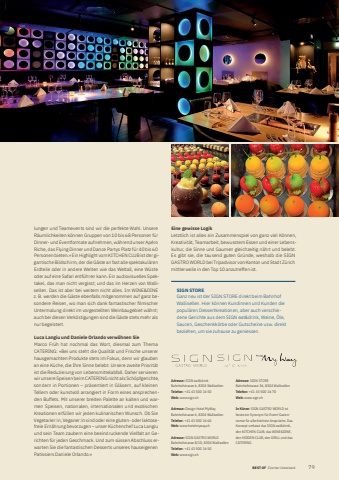 BEST OF Portrait xxx 792Adresse: SIGN eat&drink Bahnhofstrasse 6, 8304 WallisellenTelefon: +41 43 500 16 50 Web: www.sign.chAdresse: Design Hotel MyWayBahnhofstrasse 6, 8304 WallisellenTelefon: +41 43 500 16 60Web: www.hotelmyway.chAdresse: SIGN GASTRO WORLD Bahnhofstrasse 8/10, 8304 WallisellenTelefon: +41 43 500 16 50Web: www.sign.chAdresse: SIGN STOREBahnhofstrasse 36, 8304 WallisellenTelefon: +41 43 500 16 70Web: www.sign.chIn K%u00fcrze: SIGN GASTRO WORLD ist heute ein Synonym f%u00fcr Event-Gastronomie f%u00fcr allerh%u00f6chste Anspr%u00fcche. Das Konzept umfasst das SIGN eat&drink, den KITCHEN CLUB, das WINE&DINE, den HIDDEN CLUB, den GRILL und das CATERING.lungen und Teamevents sind wir die perfekte Wahl. Unsere R%u00e4umlichkeiten k%u00f6nnen Gruppen von 10 bis 68 Personen f%u00fcr Dinner- und Eventformate aufnehmen, w%u00e4hrend unser Ap%u00e9ro Riche, das Flying Dinner und Dance Partys Platz f%u00fcr 40 bis 60 Personen bieten.%u00bb Ein Highlight vom KITCHEN CLUB ist der gigantische Bildschirm, der die G%u00e4ste an fast alle spektakul%u00e4ren Erdteile oder in andere Welten wie das Weltall, eine W%u00fcste oder auf eine Safari entf%u00fchren kann. Ein audiovisuelles Spektakel, das man nicht vergisst; und das im Herzen von Wallisellen. Das ist aber bei weitem nicht alles. Im WINE&DINE z. B. werden die G%u00e4ste ebenfalls mitgenommen auf ganz besondere Reisen, wo man sich dank fantastischer fi lmischer Untermalung direkt im vorgestellten Weinbaugebiet w%u00e4hnt; auch bei diesen Verk%u00f6stigungen sind die G%u00e4ste stets mehr als nur begeistert.Luca Langiu und Daniele Orlando verw%u00f6hnen SieMarco Fr%u00fch hat nochmal das Wort, diesmal zum Thema CATERING: %u00abBei uns steht die Qualit%u00e4t und Frische unserer hausgemachten Produkte stets im Fokus, denn wir glauben an eine K%u00fcche, die Ihre Sinne belebt. Unsere zweite Priorit%u00e4t ist die Reduzierung von Lebensmittelabfall. Daher servieren wir unsere Speisen beim CATERING nicht als Sch%u00f6pfgerichte, sondern in Portionen %u2013 pr%u00e4sentiert in Gl%u00e4sern, auf kleinen Tellern oder kunstvoll arrangiert in Form eines ansprechenden Buffets. Mit unserer breiten Palette an kalten und warmen Speisen, nationalen, internationalen und exotischen Kreationen erf%u00fcllen wir jeden kulinarischen Wunsch. Ob Sie Vegetarier:in, Veganer:in sind oder eine gluten- oder laktosefreie Ern%u00e4hrung bevorzugen %u2013 unser K%u00fcchenchef Luca Langiu und sein Team zaubern eine beeindruckende Vielfalt an Gerichten f%u00fcr jeden Geschmack. Und zum s%u00fcssen Abschluss erwarten Sie die fantastischen Desserts unseres hauseigenen Patissiers Daniele Orlando.%u00bbSIGN STOREGanz neu ist der SIGN STORE direkt beim Bahnhof Wallisellen. Hier k%u00f6nnen Kundinnen und Kunden die popul%u00e4ren Dessert kreationen, aber auch verschiedene Gerichte aus dem SIGN eat&drink, Weine, %u00d6le, Saucen, Geschenkk%u00f6rbe oder Gutscheine usw. direkt beziehen, um sie zuhause zu geniessen.Eine gewisse LogikLetztlich ist alles ein Zusammenspiel von ganz viel K%u00f6nnen, Kreativit%u00e4t, Teamarbeit, bewusstem Essen und einer Lebenskultur, die Sinne und Gaumen gleichzeitig n%u00e4hrt und belebt. Es gibt sie, die tausend guten Gr%u00fcnde, weshalb die SIGN GASTRO WORLD bei Tripadvisor von Kanton und Stadt Z%u00fcrich mittlerweile in den Top 10 anzutreffen ist. BEST OF Z%u00fcrcher Unterland