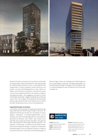 BEST OFBEST OF Z%u00fcrcher Unterland Portrait xxx 812Adresse: Baudicht%u00a0AGBrandbachstrasse 10, 8305 DietlikonTelefon: +41 44 515 67 68E-Mail: info@baudicht-ag.chWeb: www.baudicht-ag.chIn K%u00fcrze: Die Baudicht%u00a0AG mit Sitz in Z%u00fcrich und St. Gallen sorgt mit ihrem hohen Qualit%u00e4tsbewusstsein f%u00fcr verl%u00e4ssliche Abdichtungen im Hoch- und Tiefbau und garantiert so einen nachhaltigen Bauerfolg. Baudicht%u00a0AG daf%u00fcr, dass keiner ihrer Kundinnen und Kunden so schnell wieder nasse F%u00fcsse bekommt. %u00abDie hohe Qualit%u00e4t der Abdichtungen zeichnet uns aus%u00bb, so der gelernte Heizungsmonteur. %u00abZudem profi tieren unsere Kundinnen und Kunden von einer Dichtheitsgarantie von zehn Jahren im Tiefbau und f%u00fcnf Jahren im Hochbau%u00bb, so Marcel Fritz. Seine Firma ist eine verl%u00e4ssliche Partnerin f%u00fcr private und %u00f6ffentliche Bauherrschaften. %u00abIch engagieren mich gern f%u00fcr Ihren nachhaltigen Bauerfolg.%u00bb Z%u00fcgige Fertigstellung ist dabei garantiert, denn: Durch eigens f%u00fcr die Baudicht%u00a0AG entwickelte Abdichtungsmaterialien k%u00f6nnen die Arbeiter auch im Winter bei tiefen Temperaturen bis zu minus 15 Grad abdichten. Fugenabdichtungen im HochbauIm Hochbau sind individuelle L%u00f6sungen ganz besonders gefragt: Dabei steht die Abdichtung mit Fugen im Zentrum. Als elastische Abdichtung sch%u00fctzen sie nachhaltig vor Feuchtigkeits-, Temperatur- und Witterungseinfl%u00fcssen und absorbieren die nat%u00fcrlichen Bewegungen der verschiedenen Baustoffe wie Keramik, Stein, Beton, Glas, Metall, Kunststoff oder Holz, sodass keine Risse entstehen. Ob Fugen bei Neu- oder Umbauten, Sanierungen oder Renovationen %u2013 als Experten im Dichtungs- und Bautenschutz bietet die Baudicht%u00a0AG eine Vielzahl an Minergie- und/oder EC-zertifi zierten Dienstleistungen f%u00fcr die individuellen Vorhaben und Bed%u00fcrfnisse ihrer Kundinnen und Kunden. Die Dienstleistungen im Bereich Fugen reichen von Kittfugen %u00fcber Silikonfugen bis hin zu Hybridfugen und Dampf- und Wasserabweisfolie. F%u00fcr stark beanspruchte Fugen in Garagen, Schwimmb%u00e4dern oder im Lebensmittelbereich setzt die Baudicht%u00a0AG individuelle L%u00f6sungen ein.