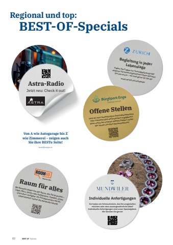 821 BEST OF BEST OF SpecialsRegional und top: BEST-OF-Specials Individuelle AnfertigungenSie haben ein Schmuckst%u00fcck, das Sie umgestalten m%u00f6chten oder eine aussergew%u00f6hnliche Idee? Individuelle Anfertigungen sind unser Spezialgebiet. Wir beraten Sie gerne! Offene StellenHast Du eine Ausbildung im Gesundheitsbereich oder m%u00f6chtest Dich ehrenamtlich engagieren? Dann schau bei unseren offenen Stellen vorbei. Wir freuen uns Dich kennenzulernen!Astra-RadioJetzt neu: Check it out!Von A wie Autogarage bis Z wie Zimmerei %u2013 zeigen auch Sie ihre BESTe Seite!bestof@miplan.chRaum f%u00fcr allesBei Room4U fi nden Sie den Raum, den Sie brauchen %u2013 Lager, B%u00fcro, Studio oder Hobbyraum. Flexibel, sicher und sofort verf%u00fcgbar. F%u00fcr Privatpersonen wie f%u00fcr Unternehmen: immer die passende L%u00f6sung.Begleitung in jeder LebenslageHaben Sie Fragen zur Vorsorgeplanung oder anderen Versicherungsthemen? Dann kommen Sie auf uns zu %u2013 wir sind gerne f%u00fcr Sie da!www.zurich.ch/schwieder