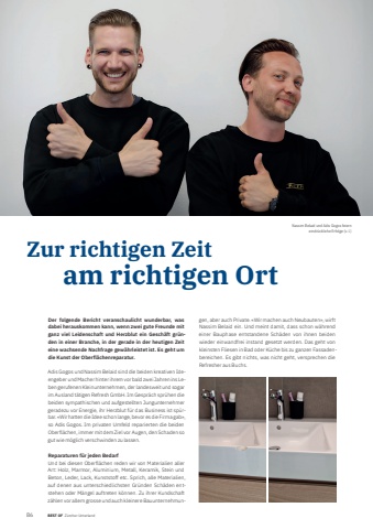 861 BEST OF BEST OF Z%u00fcrcher Unterland Portrait xxxZur richtigen Zeit am richtigen OrtDer folgende Bericht veranschaulicht wunderbar, was dabei herauskommen kann, wenn zwei gute Freunde mit ganz viel Leidenschaft und Herzblut ein Gesch%u00e4ft gr%u00fcnden in einer Branche, in der gerade in der heutigen Zeit eine wachsende Nachfrage gew%u00e4hrleistet ist. Es geht um die Kunst der Oberfl%u00e4chenreparatur.Adis Gogos und Nassim Belaid sind die beiden kreativen Ideengeber und Macher hinter ihrem vor bald zwei Jahren ins Leben gerufenen Kleinunternehmen, der landesweit und sogar im Ausland t%u00e4tigen Refresh GmbH. Im Gespr%u00e4ch spr%u00fchen die beiden sympathischen und aufgestellten Jungunternehmer geradezu vor Energie, ihr Herzblut f%u00fcr das Business ist sp%u00fcrbar. %u00abWir hatten die Idee schon lange, bevor es die Firma gab%u00bb, so Adis Gogos. Im privaten Umfeld reparierten die beiden Oberfl%u00e4chen, immer mit dem Ziel vor Augen, den Schaden so gut wie m%u00f6glich verschwinden zu lassen. Reparaturen f%u00fcr jeden BedarfUnd bei diesen Oberfl%u00e4chen reden wir von Materialien aller Art: Holz, Marmor, Aluminium, Metall, Keramik, Stein und Beton, Leder, Lack, Kunststoff etc. Sprich, alle Materialien, auf denen aus unterschiedlichsten Gr%u00fcnden Sch%u00e4den entstehen oder M%u00e4ngel auftreten k%u00f6nnen. Zu ihrer Kundschaft z%u00e4hlen vor allem grosse und auch kleinere BauunternehmunNassim Belaid und Adis Gogos feiern eindr%u00fcckliche Erfolge (v. l.) gen, aber auch Private. %u00abWir machen auch Neubauten%u00bb, wirft Nassim Belaid ein. Und meint damit, dass schon w%u00e4hrend einer Bauphase entstandene Sch%u00e4den von ihnen beiden wieder einwandfrei instand gesetzt werden. Das geht von kleinsten Fliesen in Bad oder K%u00fcche bis zu ganzen Fassadenbereichen. Es gibt nichts, was nicht geht, versprechen die Refresher aus Buchs.