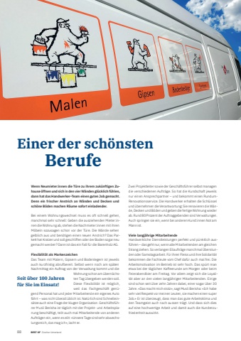 881 BEST OF BEST OF Z%u00fcrcher Unterland Portrait xxxEiner der sch%u00f6nsten BerufeWenn Neumieter:innen die T%u00fcre zu ihrem zuk%u00fcnftigen Zuhause %u00f6ffnen und sich in den vier W%u00e4nden gl%u00fccklich f%u00fchlen, dann hat das Handwerker-Team einen guten Job gemacht. Denn ein frischer Anstrich an W%u00e4nden und Decken und sch%u00f6ne B%u00f6den machen R%u00e4ume sofort einladender.Bei einem Wohnungswechsel muss es oft schnell gehen, manchmal sehr schnell: Geben die ausziehenden Mieter:innen die Wohnung ab, stehen die Nachmieter:innen mit ihren M%u00f6beln sozusagen schon vor der T%u00fcre. Die W%u00e4nde sehen gelblich aus und ben%u00f6tigen einen neuen Anstrich? Das Parkett hat Kratzer und soll geschliffen oder der Boden sogar neu gemacht werden? Dann ist das ein Fall f%u00fcr die Barenholz AG. Flexibilit%u00e4t als MarkenzeichenDas Team mit Malern, Gipsern und Bodenlegern ist jeweils auch kurzfristig abrufbereit. Selbst wenn noch am sp%u00e4ten Nachmittag ein Auftrag von der Verwaltung kommt und die Wohnung schon am %u00fcbern%u00e4chsten Tag %u00fcbergeben werden soll. Diese Flexibilit%u00e4t ist m%u00f6glich, weil das Fachgesch%u00e4ft gen%u00fcgend Personal hat und jeder Mitarbeitende ein eigenes Auto f%u00e4hrt %u2013 was nicht %u00fcberall %u00fcblich ist. Nat%u00fcrlich sind Schnelleins%u00e4tze auch eine Frage der klugen Organisation. Gesch%u00e4ftsf%u00fchrer Musli Berisha ist t%u00e4glich mit der Projekt- und Arbeitsplanung besch%u00e4ftigt, teilt auch mal Mitarbeitende von anderen Auftr%u00e4gen ein, wenn es eilt: %u00abUnsere Tage sind sehr abwechslungsreich, das mag ich%u00bb, lacht er.Zwei Projektleiter sowie der Gesch%u00e4ftsf%u00fchrer selbst managen die verschiedenen Auftr%u00e4ge. So hat die Kundschaft jeweils nur einen Ansprechpartner %u2013 und bekommt einen RundumRenovationsservice. Die Handwerker erhalten die Schl%u00fcssel und %u00fcbernehmen die Verantwortung: Sie renovieren die W%u00e4nde, Decken und B%u00f6den und geben die fertige Wohnung wieder ab. Rund 80 Prozent der Auftraggebenden sind Verwaltungen. Auch springen sie ein, wenn bei anderen Kund:innen Not am Mann ist.Viele langj%u00e4hrige MitarbeitendeHandwerkliche Dienstleistungen perfekt und p%u00fcnktlich ausf%u00fchren %u2013 das geht nur, wenn alle Mitarbeitenden am gleichen Strang ziehen. So verlangen Eilauftr%u00e4ge manchmal %u00dcberstunden oder Samstagsarbeit. F%u00fcr ihren Fleiss und ihre Solidarit%u00e4t bekommen die Fachleute vom Chef daf%u00fcr auch mal frei. Die Arbeitsmotivation im Betrieb ist sehr hoch. Das sp%u00fcrt man etwa bei der t%u00e4glichen Kaffeerunde am Morgen oder beim Feierabendbier am Freitag. Vor allem zeigt sich die Loyalit%u00e4t aber an den vielen langj%u00e4hrigen Mitarbeitenden. Einige sind schon seit %u00fcber zehn Jahren dabei, einer sogar %u00fcber 30 Jahre. %u00abDas macht mich stolz%u00bb, sagt Musli Berisha: %u00abIch habe sehr viel Respekt vor meinen Leuten, sie machen einen super Job.%u00bb Er ist %u00fcberzeugt, dass man das gute Arbeitsklima und den Teamgeist auch nach aussen tr%u00e4gt. Und dass sich dies auf eine hochwertige Arbeit und damit auch die Kundenzufriedenheit auswirkt.Seit %u00fcber 100 Jahren f%u00fcr Sie im Einsatz!