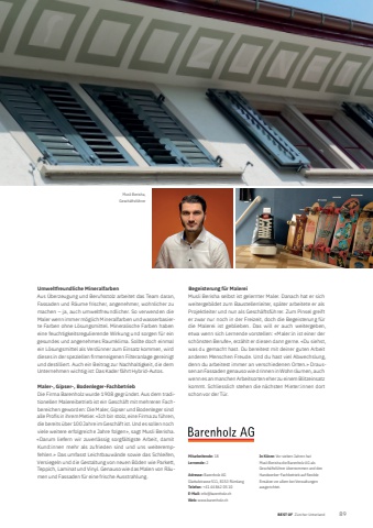 BEST OFBEST OF Z%u00fcrcher Unterland Portrait xxx 892Mitarbeitende: 18Lernende: 2Adresse: Barenholz AGGlattalstrasse 511, 8153 R%u00fcmlangTelefon: +41 44 862 05 10E-Mail: info@barenholz.chWeb: www.barenholz.chIn K%u00fcrze: Vor sieben Jahren hat Musli Berisha die Barenholz AG als Gesch%u00e4ftsf%u00fchrer %u00fcbernommen und den Handwerker-Fachbetrieb auf flexible Eins%u00e4tze vor allem bei Verwaltungen ausgerichtet. Umweltfreundliche MineralfarbenAus %u00dcberzeugung und Berufsstolz arbeitet das Team daran, Fassaden und R%u00e4ume frischer, angenehmer, wohnlicher zu machen %u2013 ja, auch umweltfreundlicher. So verwenden die Maler wenn immer m%u00f6glich Mineralfarben und wasserbasierte Farben ohne L%u00f6sungsmittel. Mineralische Farben haben eine feuchtigkeitsregulierende Wirkung und sorgen f%u00fcr ein gesundes und angenehmes Raumklima. Sollte doch einmal ein L%u00f6sungsmittel als Verd%u00fcnner zum Einsatz kommen, wird dieses in der speziellen fi rmeneigenen Filteranlage gereinigt und destilliert. Auch ein Beitrag zur Nachhaltigkeit, die dem Unternehmen wichtig ist: Das Kader f%u00e4hrt Hybrid-Autos.Maler-, Gipser-, Bodenleger-FachbetriebDie Firma Barenholz wurde 1908 gegr%u00fcndet. Aus dem traditionellen Malereibetrieb ist ein Gesch%u00e4ft mit mehreren Fachbereichen geworden: Die Maler, Gipser und Bodenleger sind alle Profi s in ihrem Metier. %u00abIch bin stolz, eine Firma zu f%u00fchren, die bereits %u00fcber 100 Jahre im Gesch%u00e4ft ist. Und es sollen noch viele weitere erfolgreiche Jahre folgen%u00bb, sagt Musli Berisha. %u00abDarum liefern wir zuverl%u00e4ssig sorgf%u00e4ltigste Arbeit, damit Kund:innen mehr als zufrieden sind und uns weiterempfehlen.%u00bb Das umfasst Leichtbauw%u00e4nde sowie das Schleifen, Versiegeln und die Gestaltung von neuen B%u00f6den wie Parkett, Teppich, Laminat und Vinyl. Genauso wie das Malen von R%u00e4umen und Fassaden f%u00fcr eine frische Ausstrahlung. Begeisterung f%u00fcr MalereiMusli Berisha selbst ist gelernter Maler. Danach hat er sich weitergebildet zum Baustellenleiter, sp%u00e4ter arbeitete er als Projektleiter und nun als Gesch%u00e4ftsf%u00fchrer. Zum Pinsel greift er zwar nur noch in der Freizeit, doch die Begeisterung f%u00fcr die Malerei ist geblieben. Das will er auch weitergeben, etwa wenn sich Lernende vorstellen: %u00abMaler:in ist einer der sch%u00f6nsten Berufe%u00bb, erz%u00e4hlt er diesen dann gerne. %u00abDu siehst, was du gemacht hast. Du bereitest mit deiner guten Arbeit anderen Menschen Freude. Und du hast viel Abwechslung, denn du arbeitest immer an verschiedenen Orten.%u00bb Draussen an Fassaden genauso wie drinnen in Wohnr%u00e4umen, auch wenn es an manchen Arbeitsorten eher zu einem Blitzeinsatz kommt. Schliesslich stehen die n%u00e4chsten Mieter:innen dort schon vor der T%u00fcr. Musli Berisha, Gesch%u00e4ftsf%u00fchrer