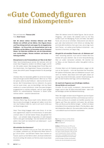 901 BEST OF BEST OF Promi%u00abGute Comedyfi guren sind inkompetent%u00bbText und Intervie Thomas L%u00fcthiFoto: Ren%u00e9 TannerSeit 30 Jahren stehen Christian H%u00f6hener und Peter Winkler als LAPSUS auf der B%u00fchne. Ihre Figuren Bruno und Theo Hitzig sind Kult und sorgen f%u00fcr ein begeistertes Publikum %u2013 im Circus Knie, am Humorfestival und in zig Auftritten auf der B%u00fchne, im Fernsehen und an Firmenanl%u00e4ssen. Im Interview erz%u00e4hlen sie, wie sie Unternehmen zum Lachen bringen, Pannen meistern und Humor mit Haltung schaffen.Worauf kommt es bei Firmenanl%u00e4ssen an? Was ist der Reiz?Peter: Gute Vorbereitung ist zentral. Wir kommen nicht mit einem fi xen Programm, sondern mit offenen Augen und Ohren. Wir wollen wissen: Was bewegt diese Firma? Was sind ihre Geschichten, ihre Eigenheiten? Daraus entwickeln wir etwas, das wirklich passt. Massgeschneidert f%u00fcr die jeweilige Firma. Christian: Was mir besonders gef%u00e4llt: Du lernst die Schweiz halt auf eine ganz andere Weise kennen. Wenn du nur Theater spielst, siehst du das Publikum %u2013 aber du lernst es nicht kennen. Bei Firmenanl%u00e4ssen bist du mittendrin. Du sp%u00fcrst, wie die Leute ticken, was sie besch%u00e4ftigt. Und das fliesst wiederum in unsere Auftritte ein. Unser Duo passt %u00fcbrigens ausgezeichnet zu solchen Anl%u00e4ssen: weil wir quasi spiegelbildlich f%u00fcr unterschiedliche Positionen in einem Unternehmen stehen %u2013 nat%u00fcrlich %u00fcberzeichnet.Das m%u00fcsst Ihr erkl%u00e4ren %u2026Christian: Meine Figur Bruno macht nichts. Wirklich nichts. Das ist seine Grundregel. Er gen%u00fcgt sich selbst, ist ein S%u00fcnneli. Das Publikum liebt ihn, weil er sich durch nichts aus der Ruhe bringen l%u00e4sst. Peter: Theo Hitzig hingegen steht unter Strom. Er ist hektisch, egozentrisch, dauernd im Krisenmodus. Er weiss alles und kann alles. Er will den besten Anlass, das gr%u00f6sste Publikum %u2013 und scheitert dabei oft grandios. Er steht beispielhaft f%u00fcr eine gute Comedyfi gur: Die sind n%u00e4mlich oft inkompetent. Das macht sie menschlich und liebenswert %u2013 auch Nervens%u00e4ge Theo.Wie entstehen Eure Nummern?Christian: Wir schreiben nicht nur am Tisch. Wir laufen herum, spielen, probieren aus. Oft %u00fcbernimmt Peter meine Figur und ich seine %u2013 das hilft beim Texten. Dann machen wir Tryouts, sp%u00fcren auf der B%u00fchne sofort, ob etwas funktioniert. Druck ist wichtig. Wir setzen uns Termine, dann muss etwas entstehen.Duo: Christian H%u00f6hener und Peter WinklerAusbildung: Lehrer und HochbauzeichnerWeb: www.lapsus.chIn K%u00fcrze: LAPSUS lernten sich 1991 an der Dimitri-Schule in Verscio TI kennen. Sie fanden schnell zueinander, waren die Landeier unter all den Typen in bunten Klamotten. Viele von ihnen waren Strassenk%u00fcnstler. H%u00f6hener und Winkler indes hatten %u00abanst%u00e4ndige%u00bb Berufe erlernt. Ihre erste gemeinsame Nummer war eine Parodie auf das Schwingen. Die Idee: eine AkrobatikNummer, der man die Akrobatik nicht ansieht.Peter: Wir denken immer f%u00fcr beide Figuren. Das ist wie ein Pingpong %u2013 sehr kreativ. Wir arbeiten nicht nur mit Text, sondern auch mit Bewegung, Musik und Video. Das beeinflusst, wie und wo wir schreiben. Diskussionen wie %u00abDas ist gut%u00bb oder %u00abDas funktioniert nicht%u00bb f%u00fchren wir st%u00e4ndig. Aber am Ende z%u00e4hlt die B%u00fchne: Dort sp%u00fcrt man, ob es tr%u00e4gt. Auch beim Tempo %u2013 wir wollen ja das Publikum mitnehmen %u2013 von Nummer zu Nummer, von Gag zu Gag. Wie geht Ihr mit sensiblen Themen wie z. B. Wokeness um?Peter: Vorsichtig nat%u00fcrlich. Auch weil ein heikles Wort den Kontext oft quasi %u00fcbert%u00f6nt. Das ist eine Herausforderung. Aber wir wollen niemanden verletzen. Wir brechen keine Tabus, um des Tabubruchs willen. Das geh%u00f6rt nicht zu LAPSUS.Christian: Wenn wir z.B. Dialekte parodieren, zeigen wir die Lust an der Sprache %u2013 nicht die Dummheit der Menschen. Wir spielen mit Klischees, aber wir reflektieren sie auch. Und wenn wir merken, dass etwas nicht mehr geht, lassen wir es weg. Das ist kein Einknicken, sondern Verantwortung. Es geht um die Freude an der Figur, nicht um Abwertung.Ihr macht ein Programm zum 30-j%u00e4hrigen Jubil%u00e4um. Worauf d%u00fcrfen wir uns freuen?Christian: Es wird visuell, musikalisch, %u00fcberraschend. Wir zeigen, was wir %u00fcber 30 Jahre entwickelt haben %u2013 aber nicht als Nostalgie, sondern als Weiterentwicklung. Peter: Wir wagen mit dem neuen Programm auch ein Experiment. Wir treten n%u00e4mlich als Peter und Christian auf, nicht nur als Theo und Bruno. Es entsteht ein Konflikt zwischen den Figuren weil Theo das nat%u00fcrlich nicht passt. Der will bloss Theo und Bruno auf die B%u00fchne bringen %u2013 einfach ein klassisches Best of. Es ist wie bei einer Band: %u00abThe Very Best%u00bb, aber kein klassisches %u00abBest of%u00bb. Die Leute sollen lachen, staunen %u2013 und vielleicht auch ein bisschen nachdenken.